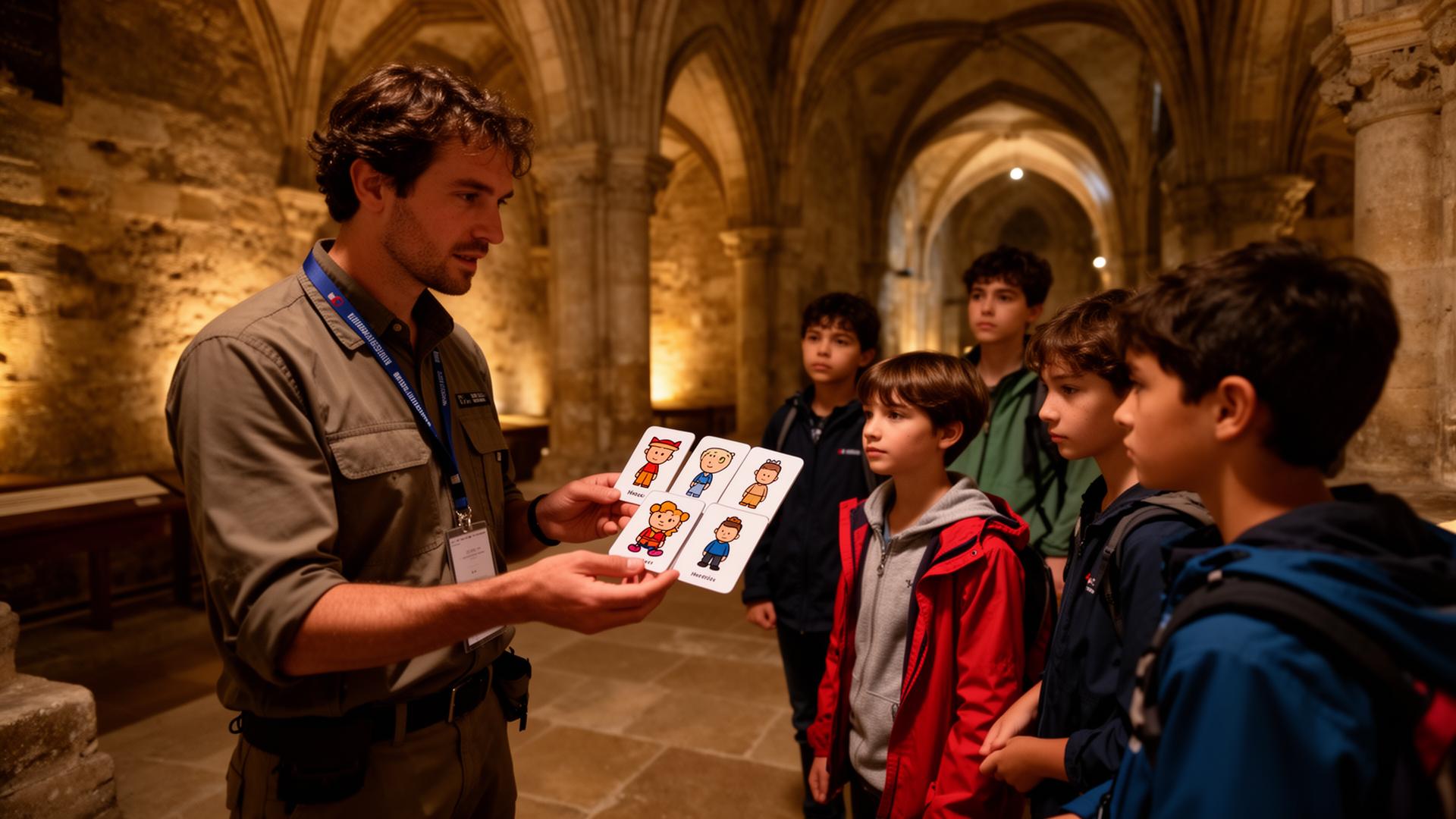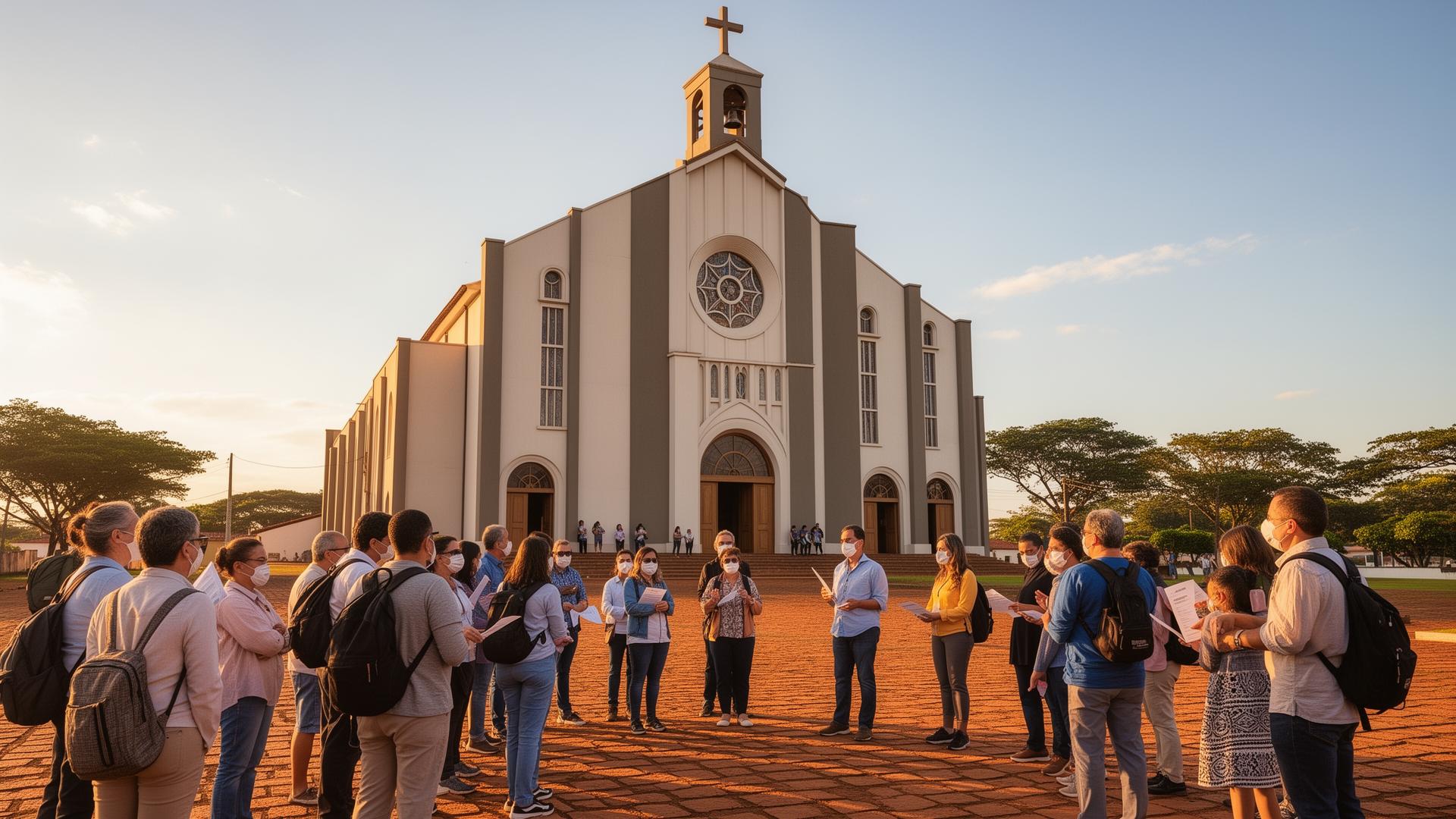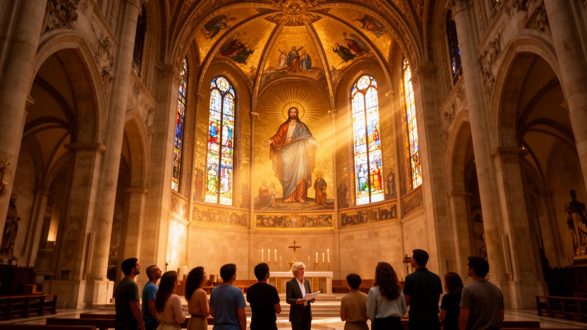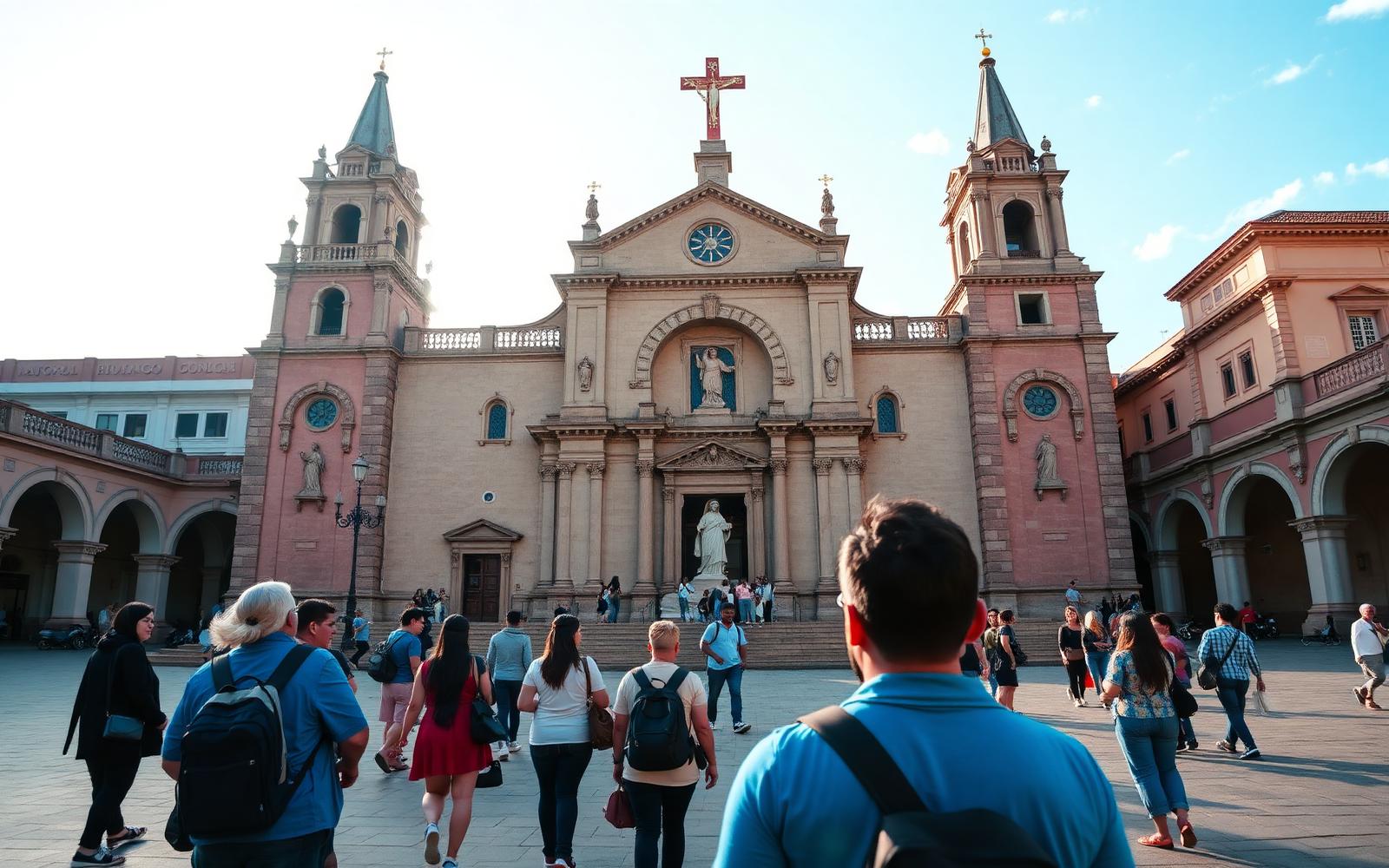 Roteiro em 8 blocos temáticos com contextualização para guia, scripts de fala e pontos de parada: fachada, história em camadas, três portas, nave central, mosaico, imagem do Padroeiro, histórias curiosas e festas atuais.